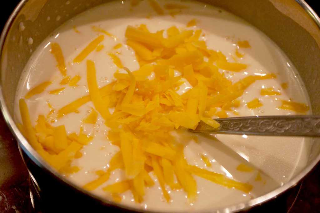 - Пока обжаривается, сделайте соус — смешайте яйца с молоком и добавьте туда тертый сыр, снова перемешайте.