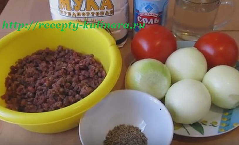 - В миске соединить все сухие компоненты для теста и влить в углубление теплую воду, вбить яйцо. В течение 5-7 минут замешивать густое, но нежное тесто, накрыть пленкой и оставить на 20 минут отдохнуть. Мясо нарезать мелкими кусочками. Меленько нашинковать очищенные луковицы, всыпать специи.