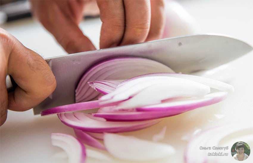 - Затем лук мелко шинкуем.