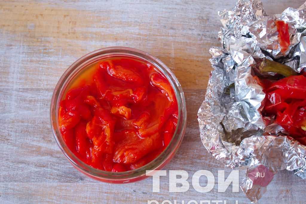 Запечённый готовый перец выдержать в герметичном контейнере, затем очистить тонкую кожицу и удалить семечки.