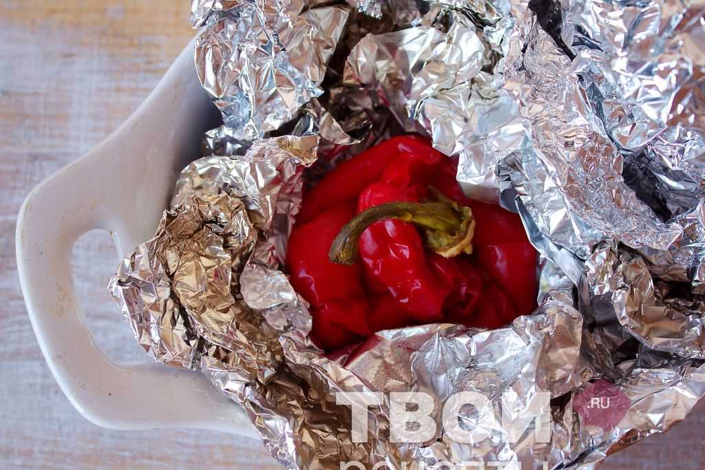 Болгарский перец красного цвета помыть, обсушить, обернуть двойным слоем фольги и запечь в разогретой до 220 гр духовке до подпалин.