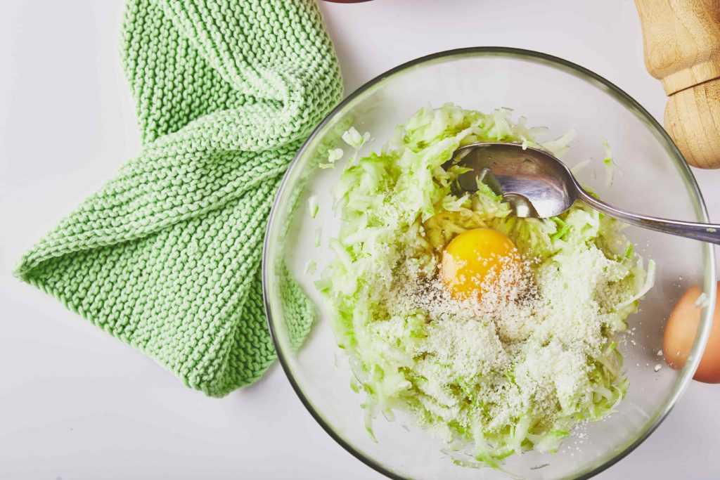 - Приготовление начинают с подготовки овощей. Их моют, чистят, натирают на терке (кабачок), нарезают мелким кубиком (лук). После этого в миску разбивают яйца, добавляют к ним измельченные продукты, специи.