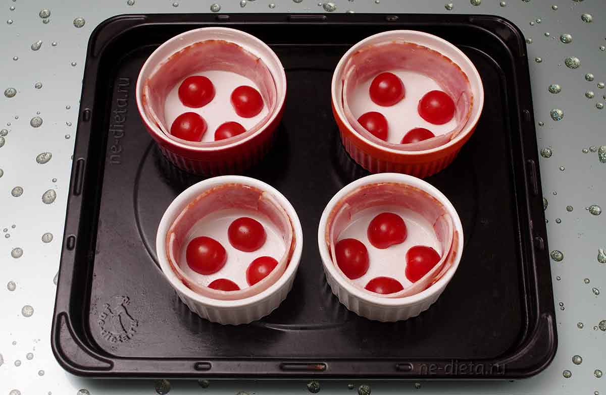 7. На дно формочек положить половинки помидорок-черри срезом вниз примерно по 4 штучки на порцию и слегка подсолить.