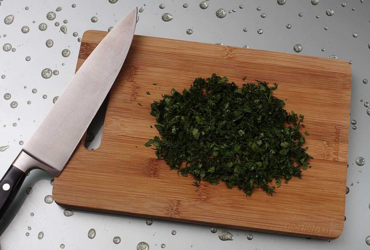 3. Зелень вымыть и обсушить, после чего оборвать самые нежные листочки и мелко их порубить. Я советую использовать для приготовления омлета укроп и/или петрушку, так как зеленый лук может быть несколько резковат, но это уже дело вкуса, так что выбор в любом случае за вами.