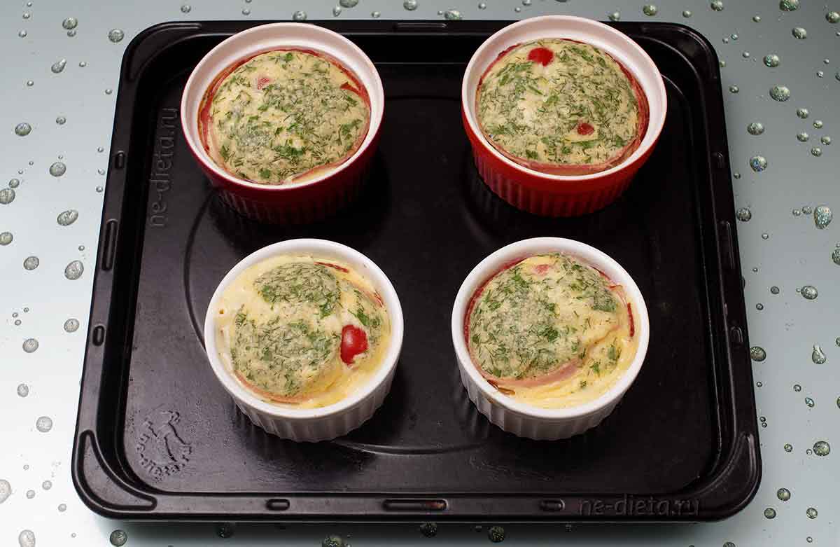 9. Маленькие формочки удобно сначала поставить на один большой противень, а затем отправить его в разогретую до 180°С духовку, где порционные омлеты будут запекаться в течение 30 минут.