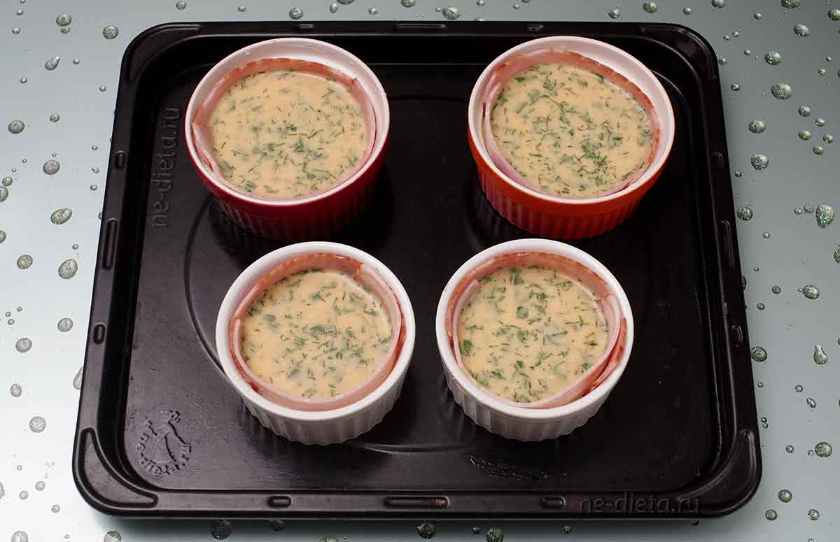 Выливаем в горшочки заливку, таким образом, чтобы до края оставалось как минимум 1-2 сантиметра свободного пространства, так как омлет будет подниматься при запекании.