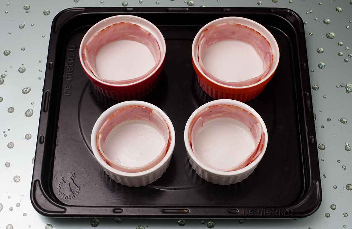 6. Формочки смазать сливочным или растительным маслом снизу и с боков и по периметру выложить 1 – 2 полоски бекона. На мой вкус, лучше использовать варено-копченый бекон, так как сырокопченый после запекания становится более жестким и к тому же его яркий привкус и аромат может перекрыть вкус других продуктов.