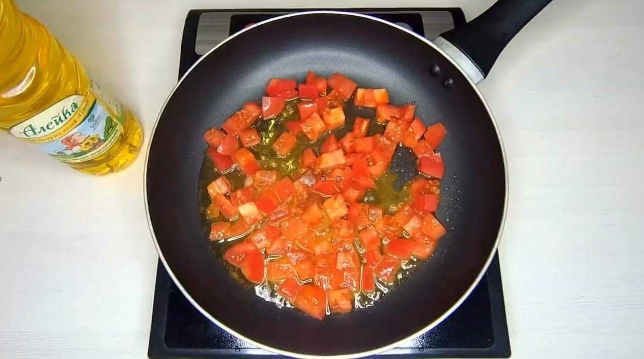 Сковороду разогреть с маслом. Высыпать на нее помидоры, порезанные на кубики. Протушить их в течение 1 минуты, не забывая помешивать.