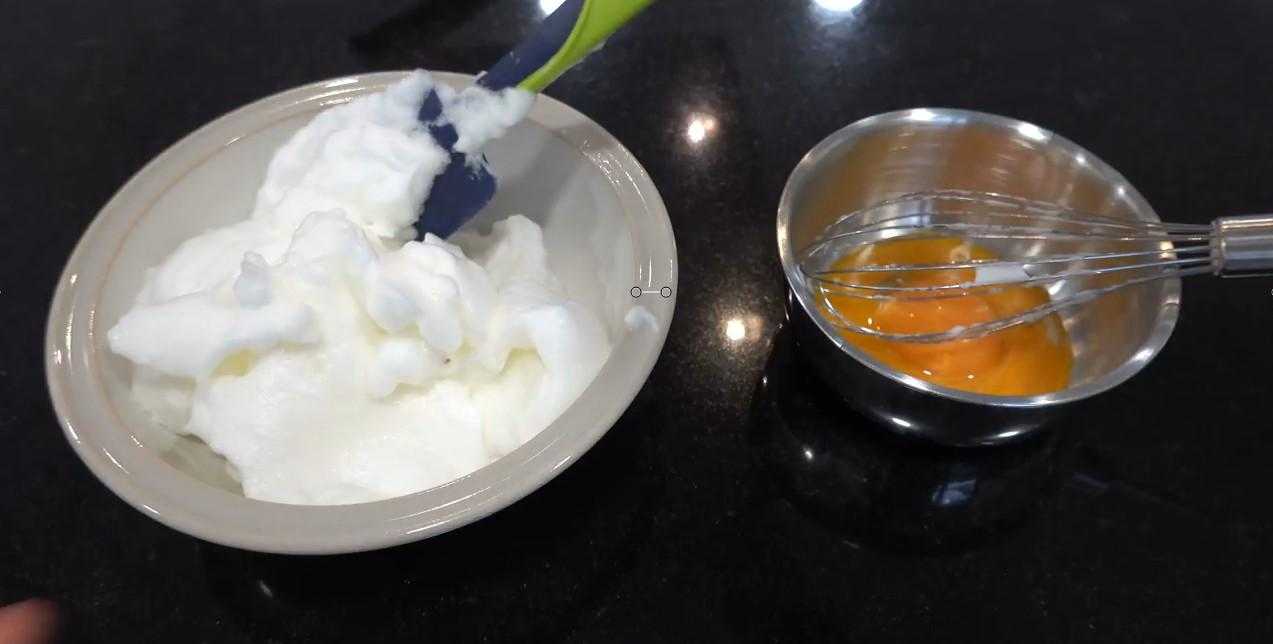 Белки и желтки нужно отделить. Белки хорошо взбиваем до получения достаточно устойчивой пены. Можно использовать простой венчик, но с миксером получится быстрее.