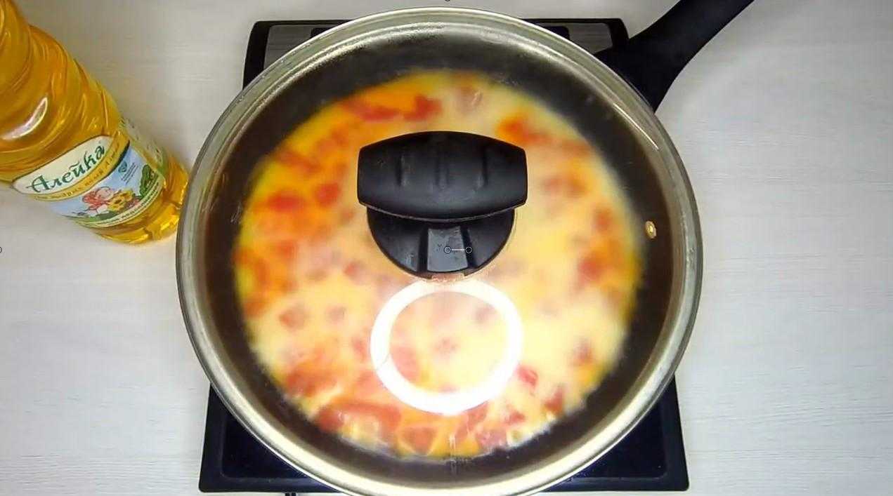 Яйцо с молоком вылить к помидорам. Сковороду накрыть крышкой. Омлет готовится примерно 7 минут. Огонь лучше выставить средний.