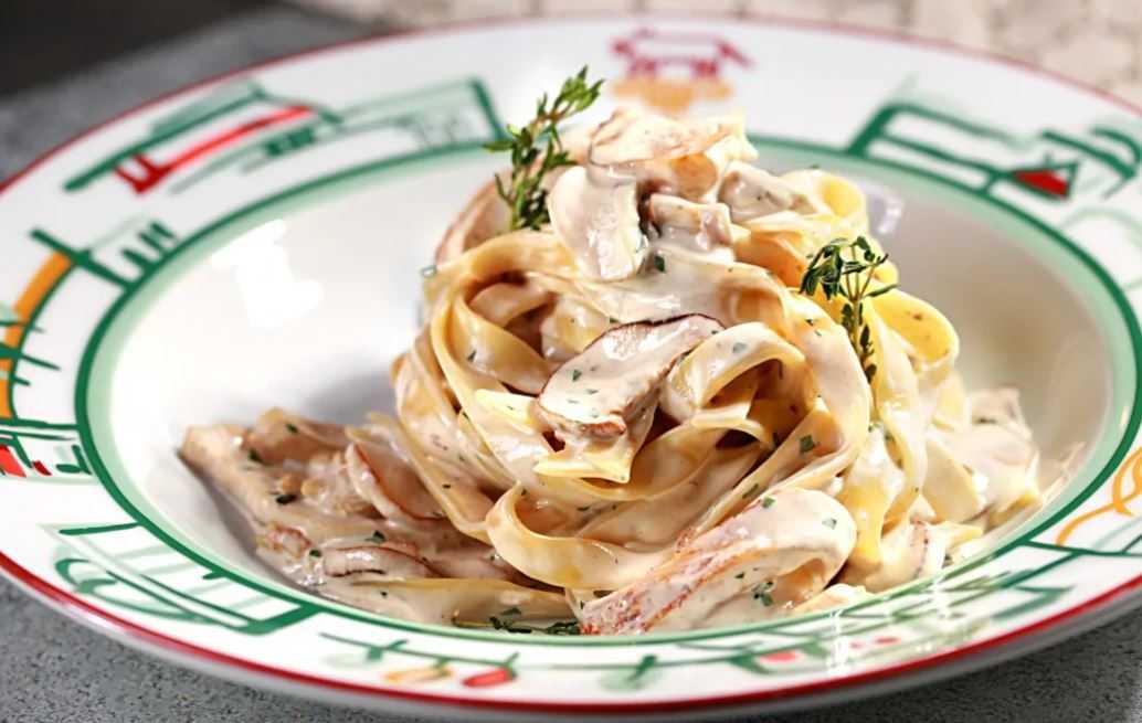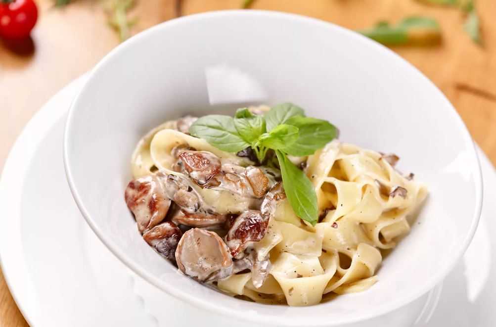Паста с белыми грибами в сливочном соусе (с сыром и чесноком)