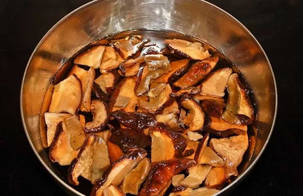 Сухие грибы предварительно замачивают. Для этого их заливают теплой водой и оставляют на 30 минут.