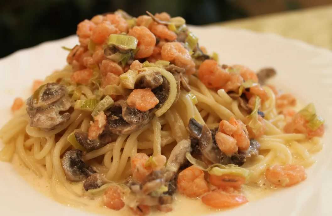Поклонникам грибов и морепродуктов следует обратить внимание на этот способ приготовления пасты. Чтобы сделать блюдо, к основным компонентам добавляют 300 г очищенных креветок
