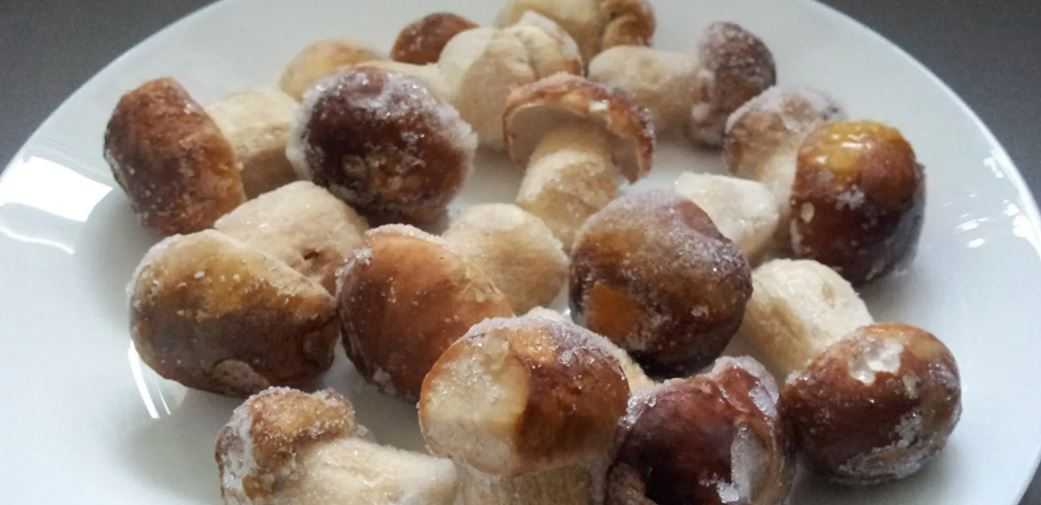 Грибочки у меня отварены в двух водах, приблизительно 40 минут времени и заморожены. По сути, они готовы к употреблению. Мне остается их только разморозить и отправить жарится к мясу.