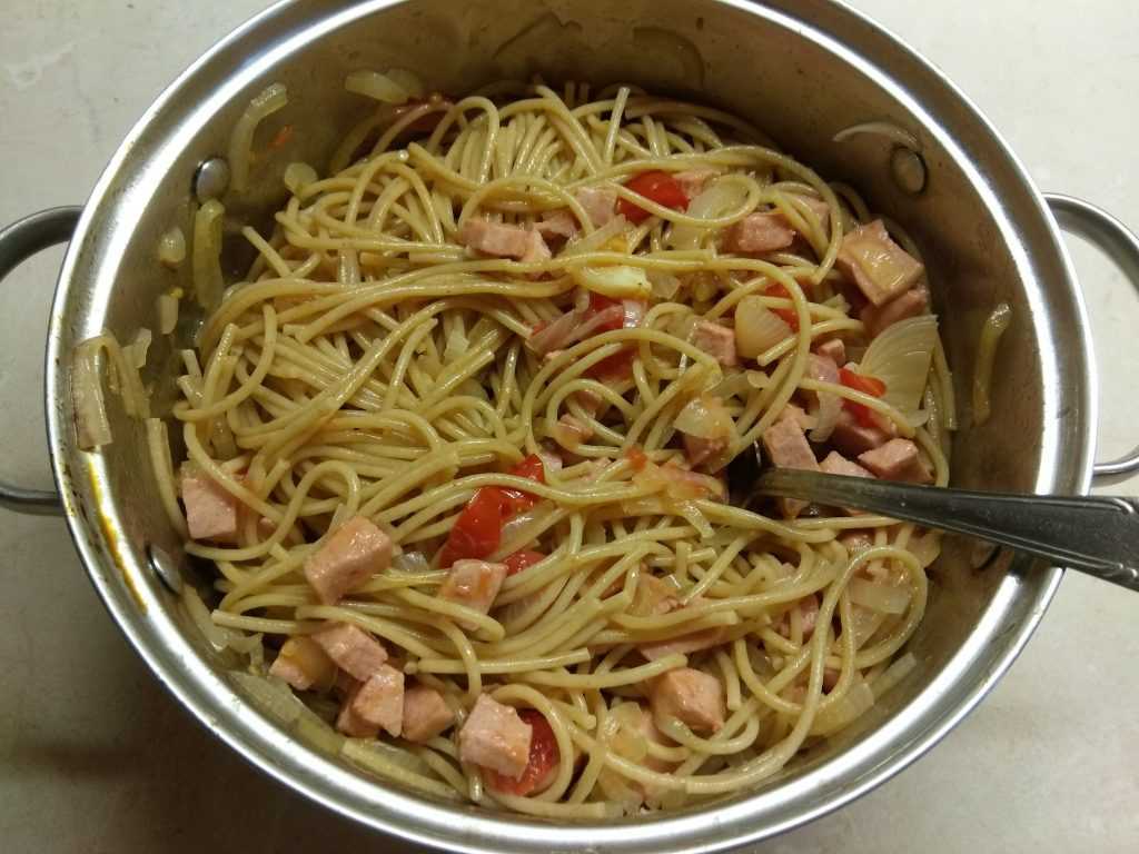 Процесс приготовления спагетти с колбасой