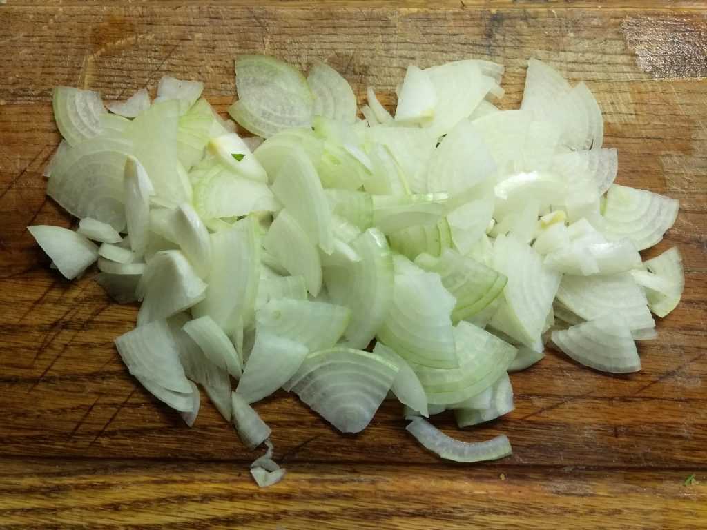 - Очищаем луковицу, промываем ее и шинкуем кубиками небольшого размера.