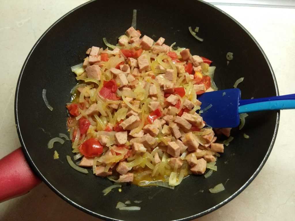 Колбасу и помидоры добавить к луку, накрыть крышкой и тушить до готовности помидоров.