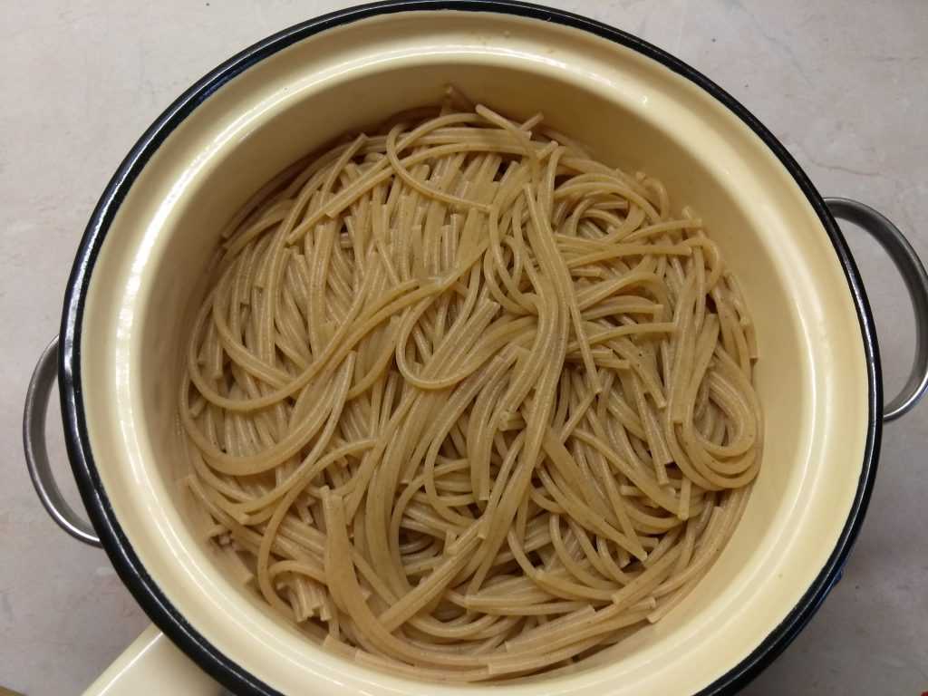 Готовые спагетти снимите с огня и слейте воду.
