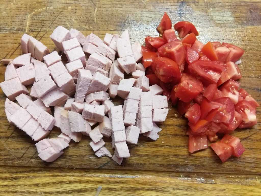 Пока готовится лук, помидоры помыть и нарезать небольшими кусками. Колбасу нарезать небольшими ломтиками.