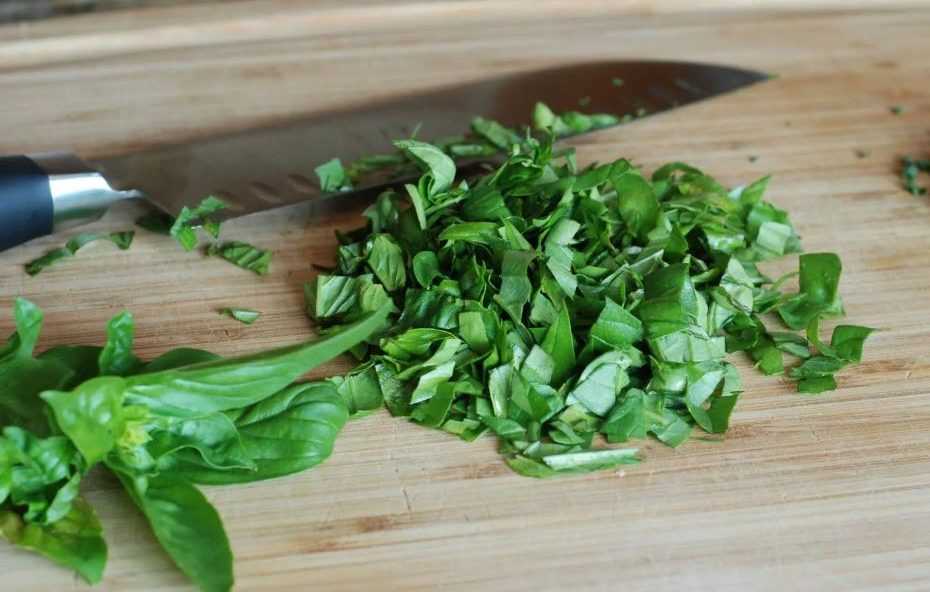 - Вымойте базилик, оборвите листья и нарежьте стебли.