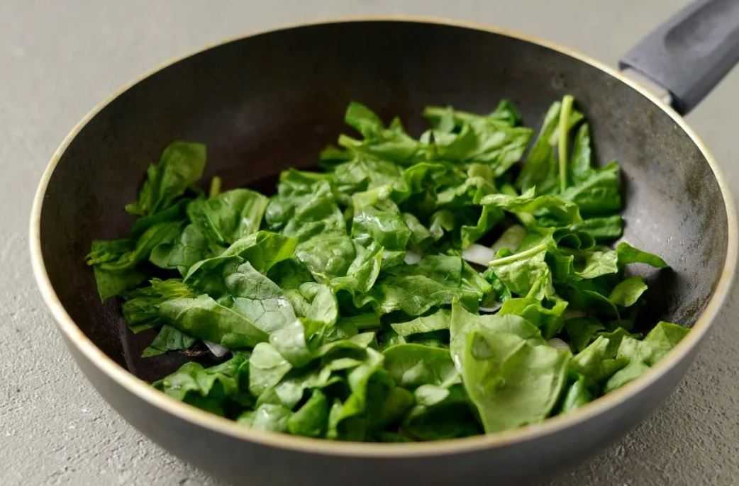 2 Шпинат выложить размораживаться на разогретую сковороду и добавить оливковое масло.