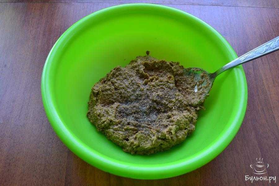 - Измельчите ингредиенты через мясорубку или комбайн, так чтобы получилось пюре.