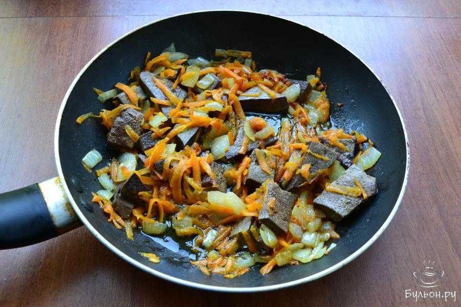 Печень остудить до теплого состояния, порезать кусочками. Обжарить печень, влив в сковороду масло растительное и добавив репчатый лук, порезанный кусочками и тертую морковь.