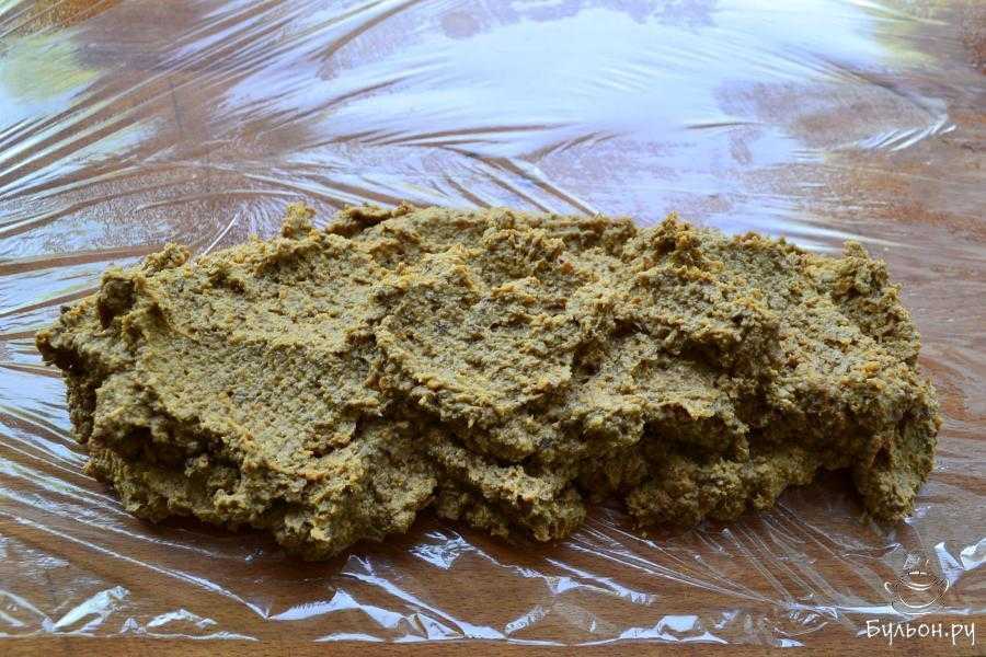 Бамбуковый коврик обмотайте пищевой пленкой или возьмите пергаментную бумагу и ровным слоем прямоугольной формы выложите печеночную смесь. Плотно ее утрамбуйте.