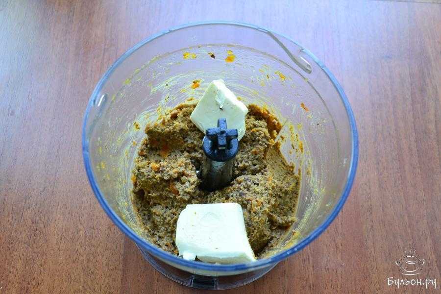 Перекрутите массу 2-3 раза, можно и больше, т.к. чем однороднее будет текстура, тем вкуснее получится закуска. Добавьте в паштет 20 грамм сливочного масла и хорошо перемешайте.