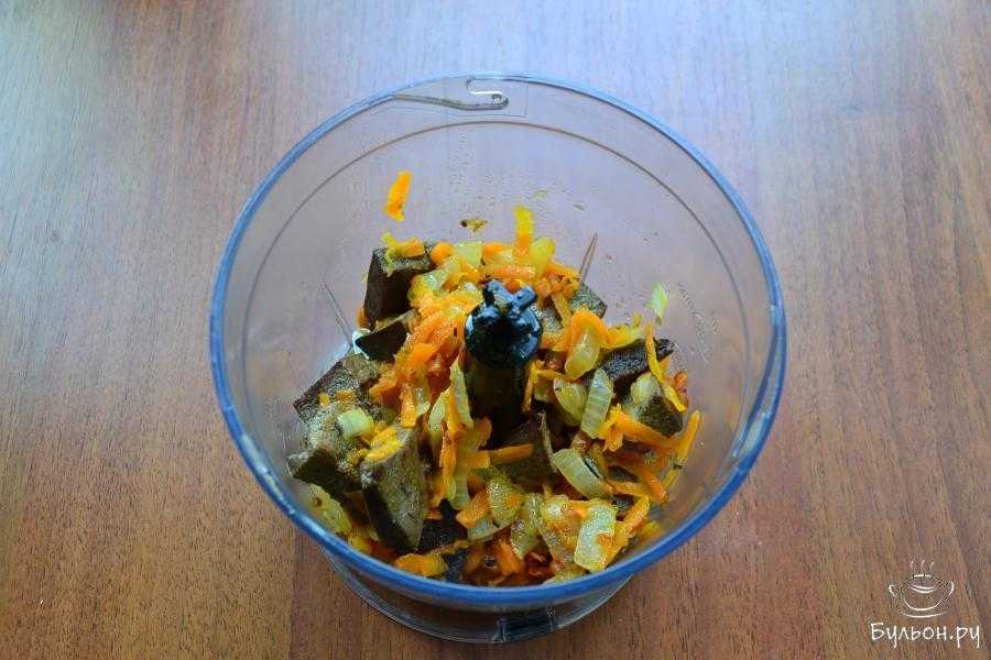 Поместить печень с овощами в чашу блендера.