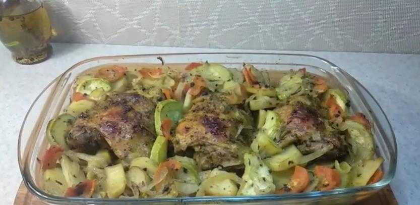 Сытную запеканку перед тем, как подать на стол, следует нарезать острым ножом на порции, украсить овощным салатом или маринованными огурцами. Запеченная курица с овощами – настоящий деликатес, способный превратится в полноценное семейное блюдо. Кулинарный шедевр выходит сытным, сочным, питательным и аппетитным.