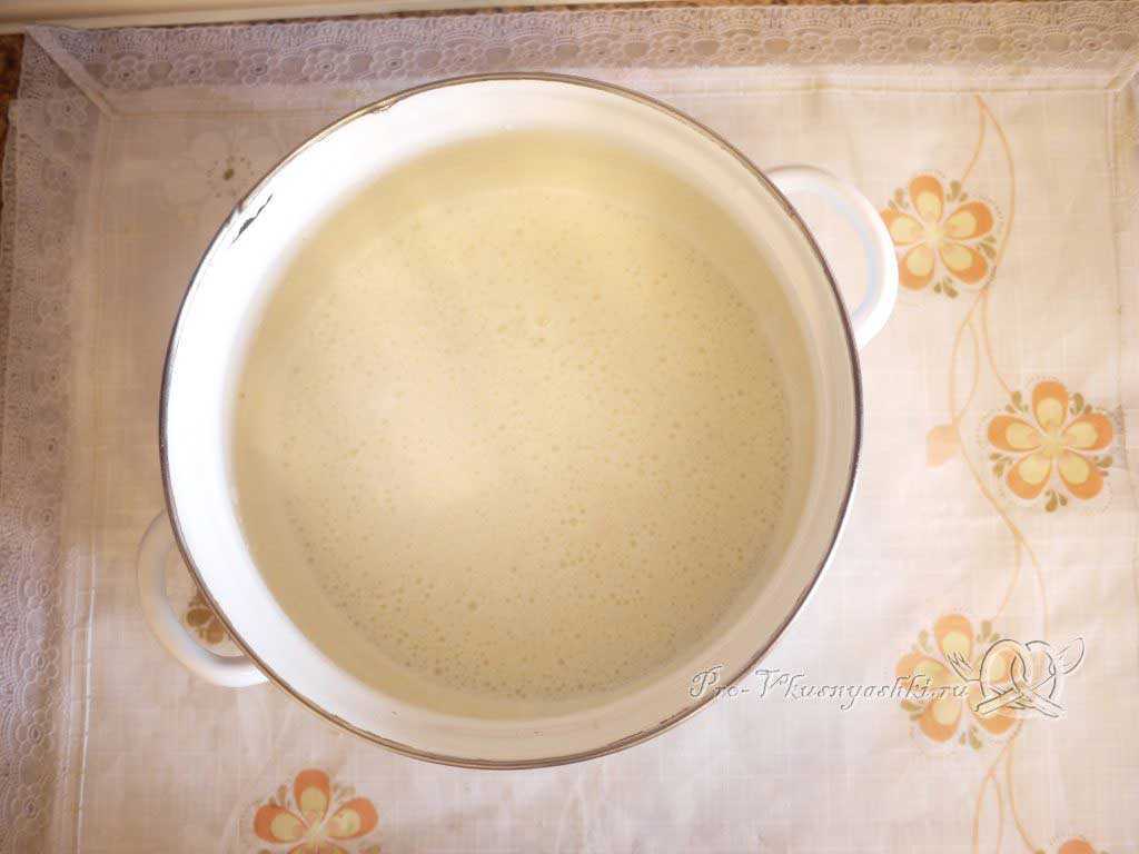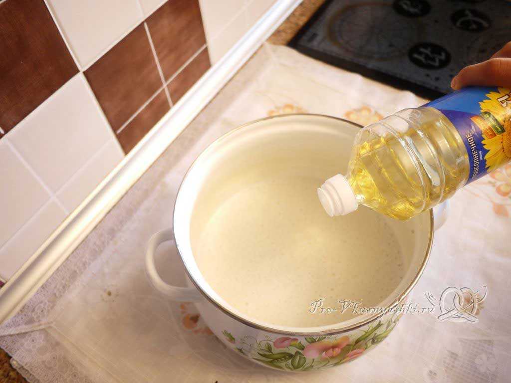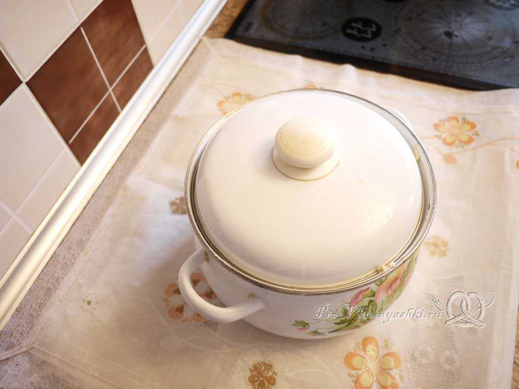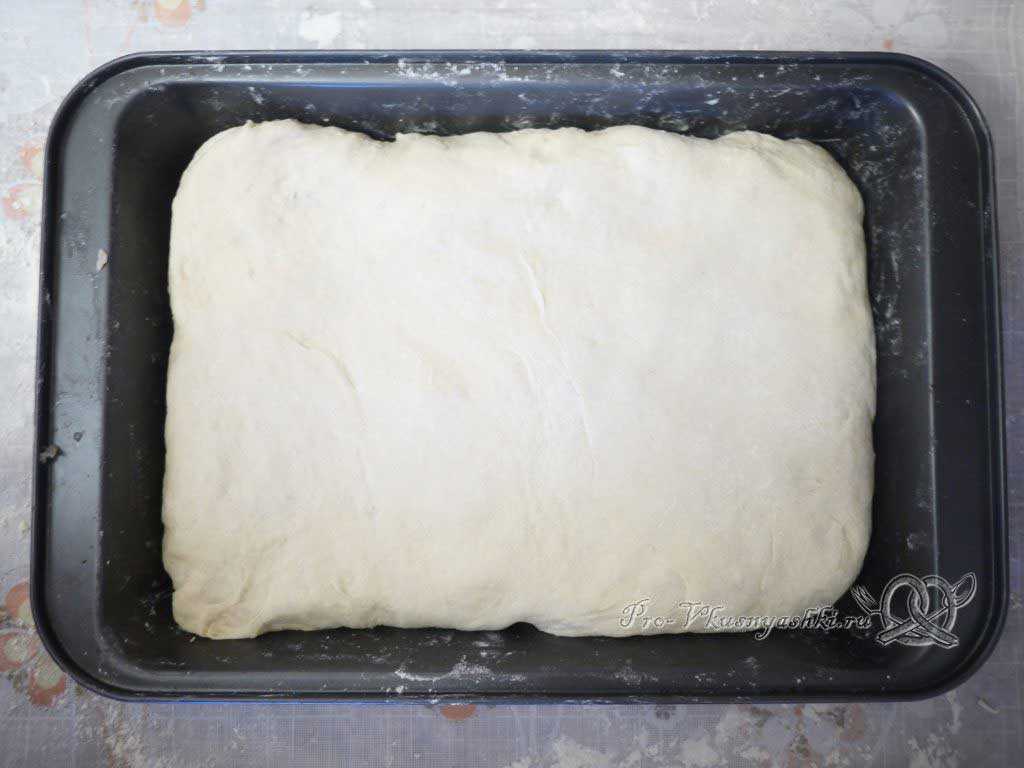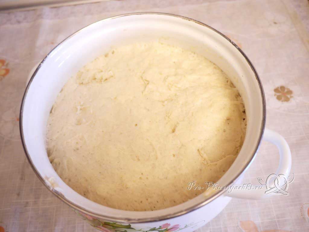 Накрываем кастрюлю крышкой, убираем ее в теплое место на 20-30 мин, когда ее содержимое увеличится в два раза, тесто нужно слегка обмять. Таким образом, мы освобождаем его от накопившихся газов и обогащаем кислородом. Оставляем еще минут на 10-15 подняться в теплом месте.