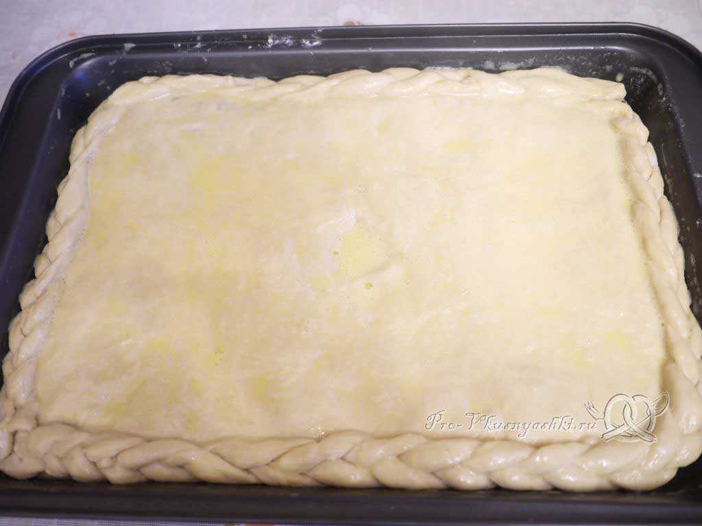 - Смазать противень маслом, застелить его слоеным пластом, сформировать бортики.