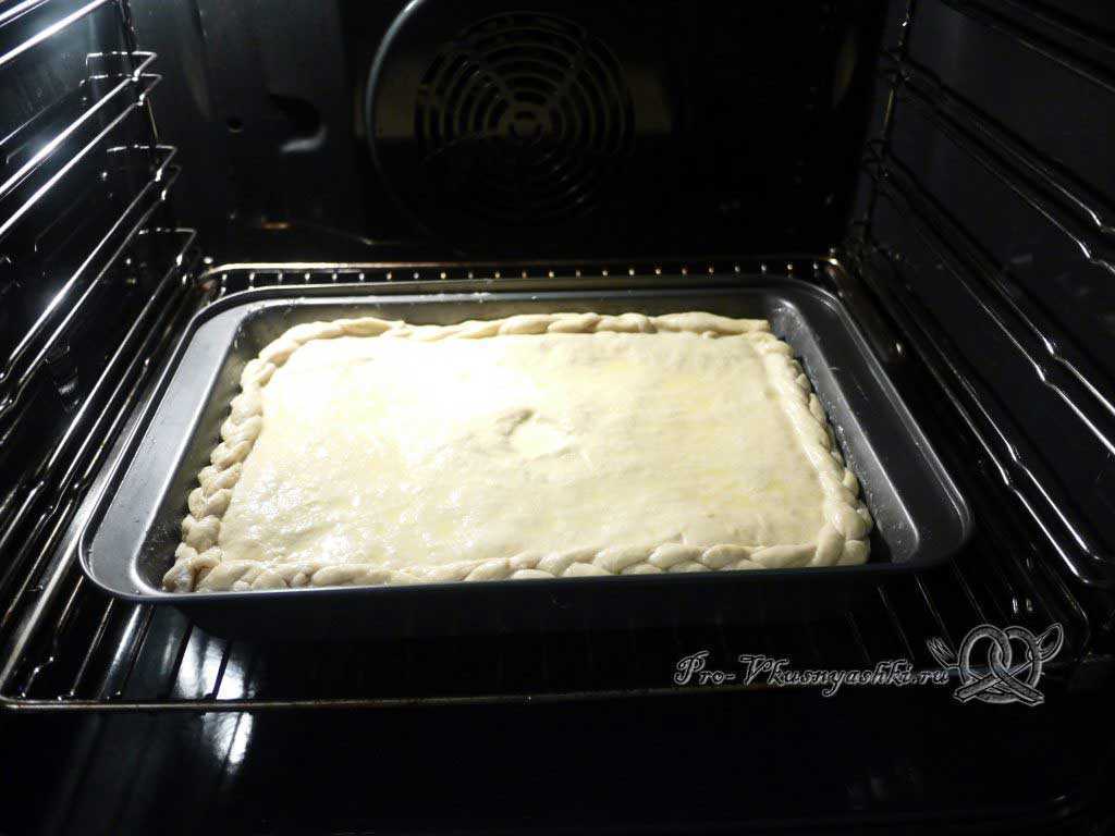 Выпекается слоёный дрожжевой пирог с грибами и сметаной при 190°C около 45 мин.
