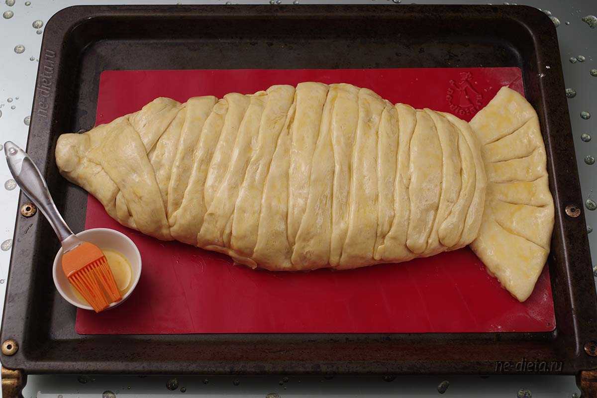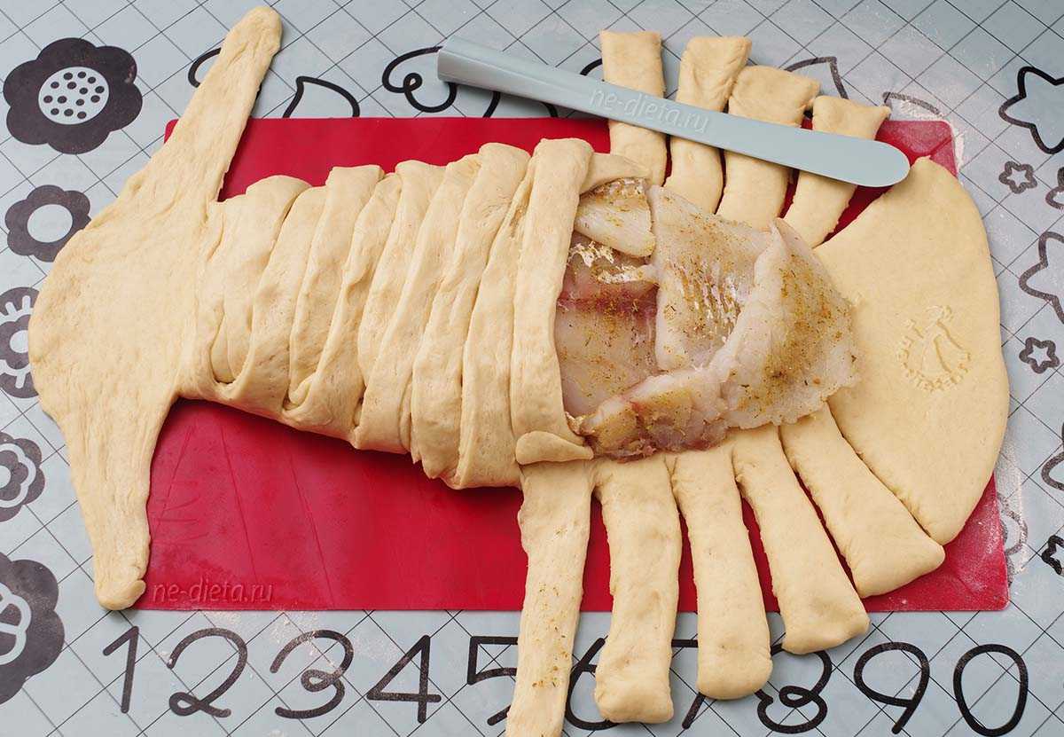 Красиво завернем полоски в хвосте. На остатке теста, который остался в хвосте, сделать надрезы, имитируя хвостовой плавник. Первый рыбник готов