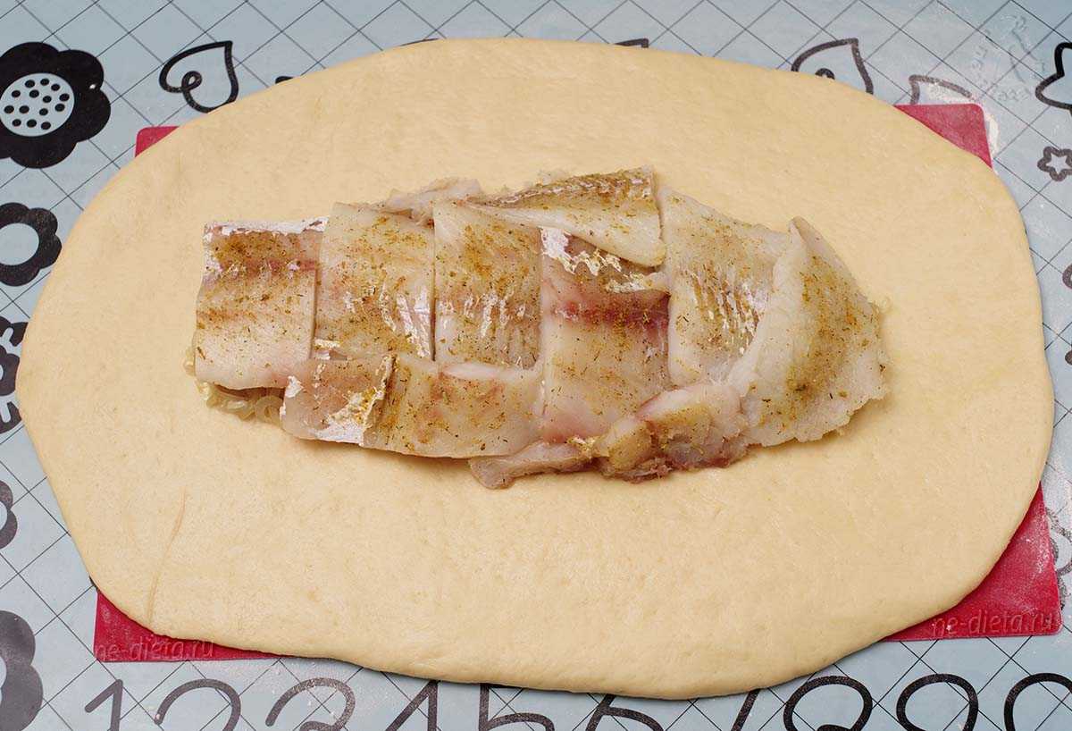 В центральной части овала выложить обжаренный лук, а на него — кусочки рыбного филе. Справа и слева от начинки оставить незанятые участки теста для «головы» и «хвоста» рыбного пирога.
