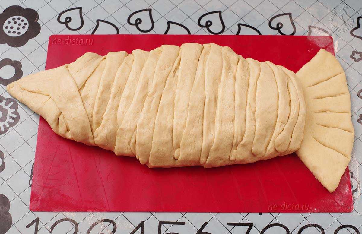 Оставшееся слева тесто переплести крест-накрест в виде рыбной головы, а тесто справа оставить как есть, придав ему форму хвоста. Можно для убедительности сделать на хвосте несколько продольных надрезов.