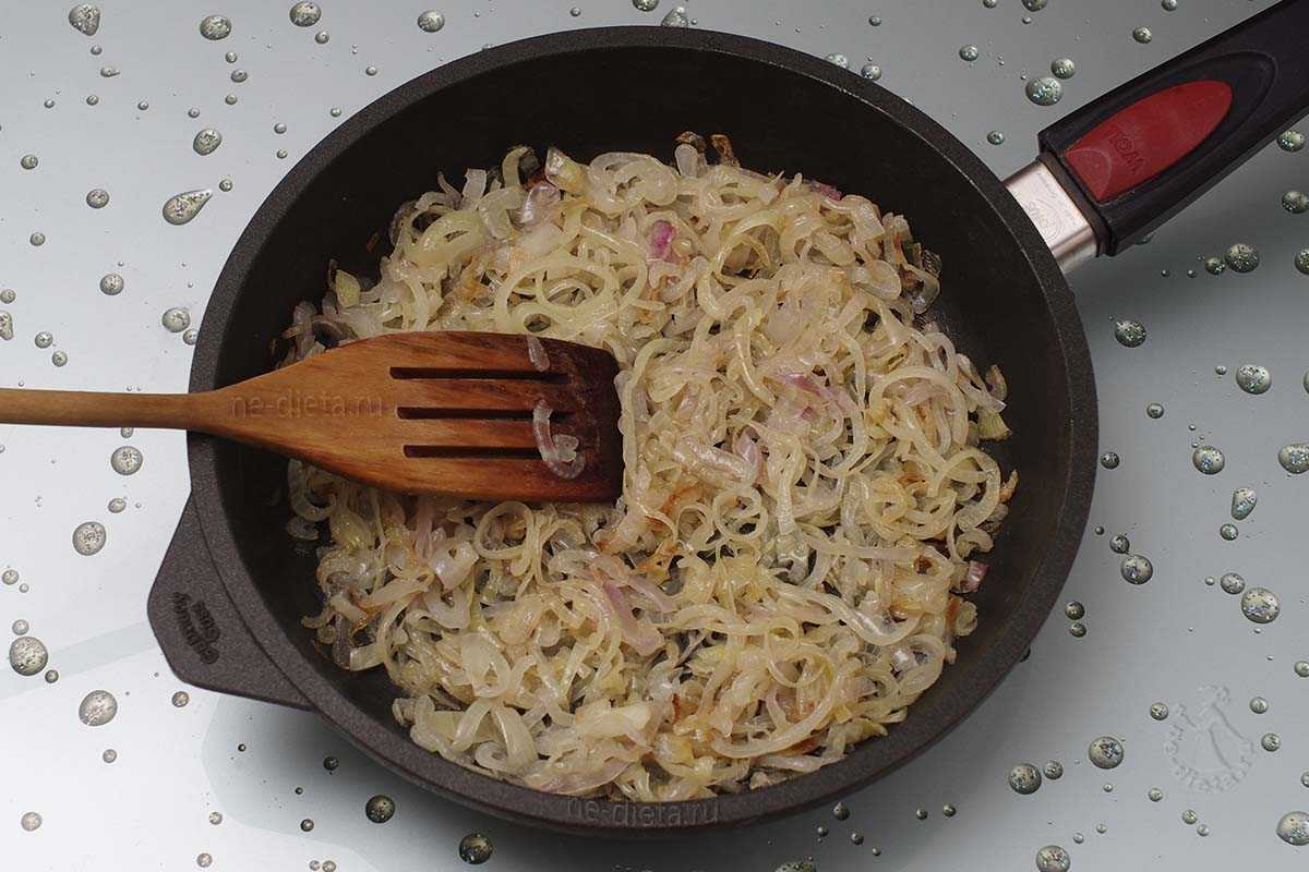 Репчатый лук обжарить на растительном масле на среднем огне, периодически помешивая, в течение 15 — 17 минут до заметного подрумянивания. Такой хорошо зажаренный лук придаст рыбному пирогу аппетитный аромат и приятный сладковатый вкус.
