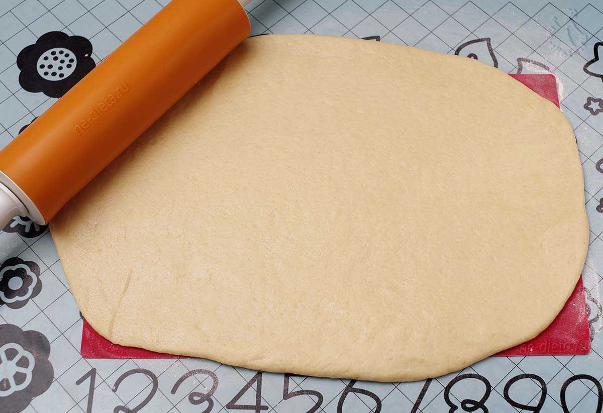 Подошедшее тесто раскатать на присыпанной мукой поверхности в большой овал по размеру противня.