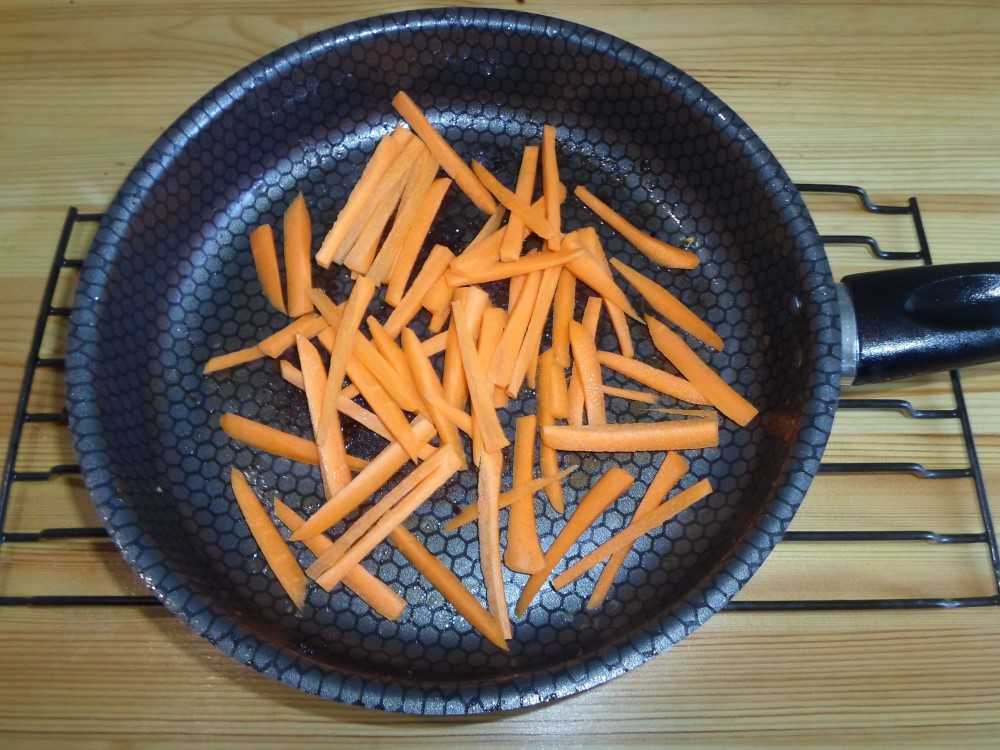 Точно также поступаем с морковью. Положите ее в сковороду и слегка обжарьте, чтобы она стала мягкой, но не пригорела.