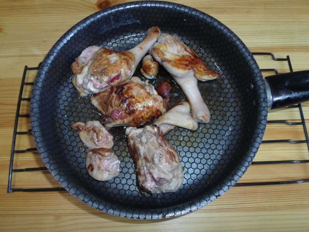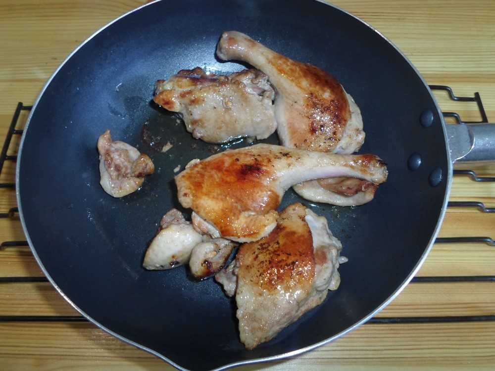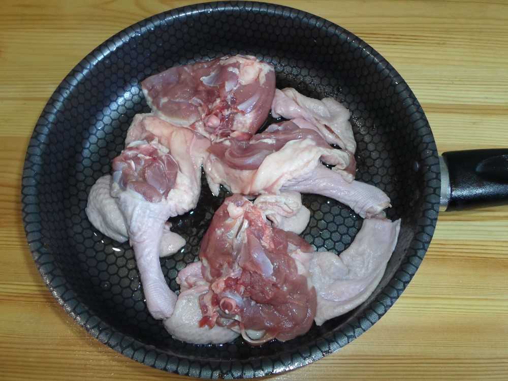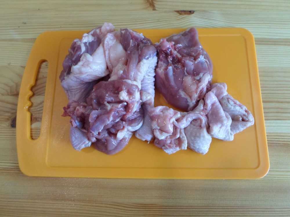 Прежде всего необходимо хорошо обработать на открытом огне тушку птицы, чтобы удалить остатки перьев. Затем ее промывают и разрезают на небольшие кусочки. При этом кости оставляют, чтобы получить хороший навар.