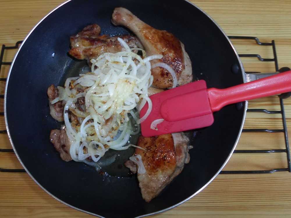 Через несколько минут добавьте нарезанный полукольцами лук, все хорошо перемешайте и готовьте на сковороде еще около 10 минут.