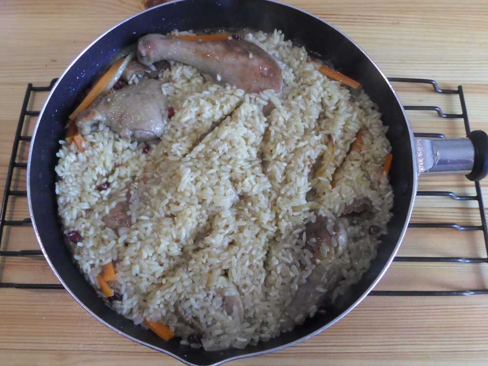 На следующем этапе в емкость помещают чернослив, барбарис и зиру. Сверху засыпают рис и заливают водой так, чтобы она была выше уровня продуктов на два сантиметра. Это нужно делать очень аккуратно, чтобы плов из утки не перемешался и не превратился в кашу. Поэтому на поверхность кладут тарелку вверх дном, на которую и льют воду. Когда казан наполнится до нужного уровня, ее убирают, аккуратно приподнимая за края, чтобы не повредить закладку.
