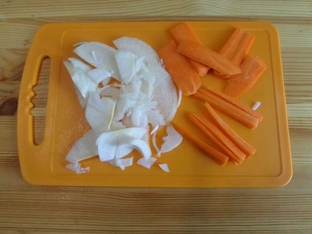 - Заранее нашинкуй лучок кольцами (можно и крупно, от этого блюдо только выиграет), натри на терке (крупной) морковь.