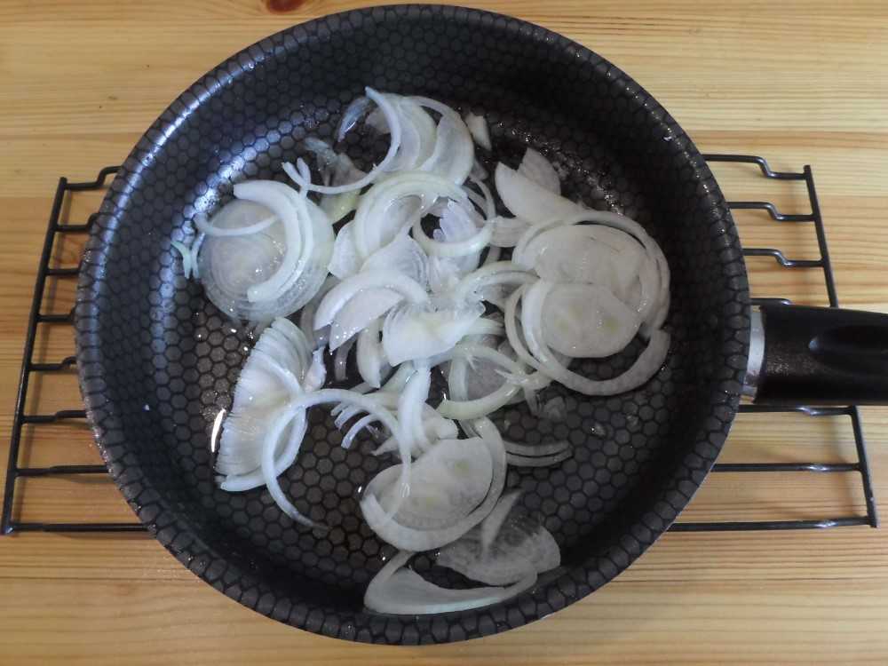 Положите лук в сковороду, налейте немного масла и обжарьте его.