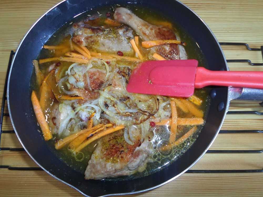 6. Помешивая, зажариваем овощи до мягкости, они тоже плавают в утином жиру.