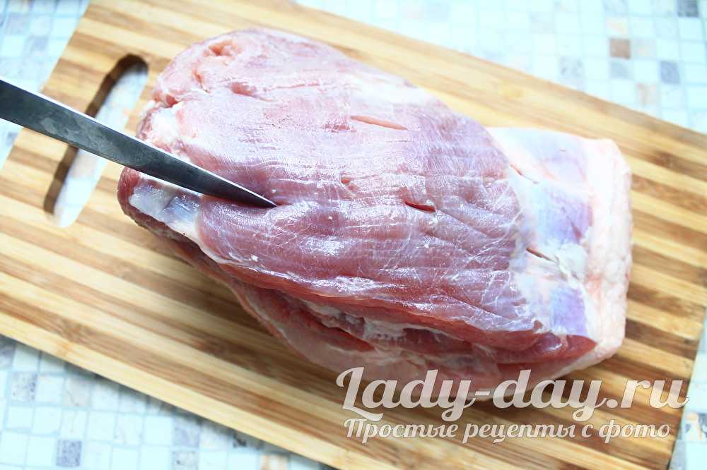 Острым ножом сделать несколько произвольных проколов в мясе. Делается это для того, дабы специи заполнили своим вкусом и ароматом мясо изнутри.