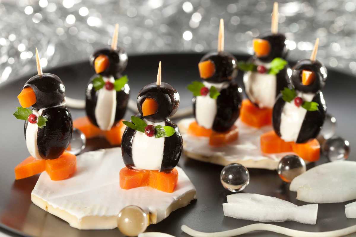 - Приступаем к формированию канапе. На шпажку насаживаем маленькую оливку, затем крупную и кружочек моркови. Получаются красивые новогодние пингвины.