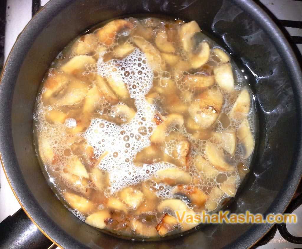 3. Грибы должны практически полностью приготовиться, то есть внешне размягчиться, потемнеть и значительно уменьшиться в размерах. Как только шампиньоны достигнут такого состояния, необходимо добавить пшенную крупу и воду, в которой она была замочена. При необходимости можно переложить все ингредиенты в более удобную кастрюлю.