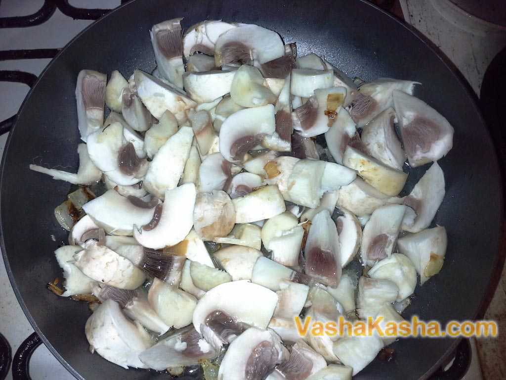 Когда лук с чесноком немного обжарятся в сковороду переложить нарезанные грибы.